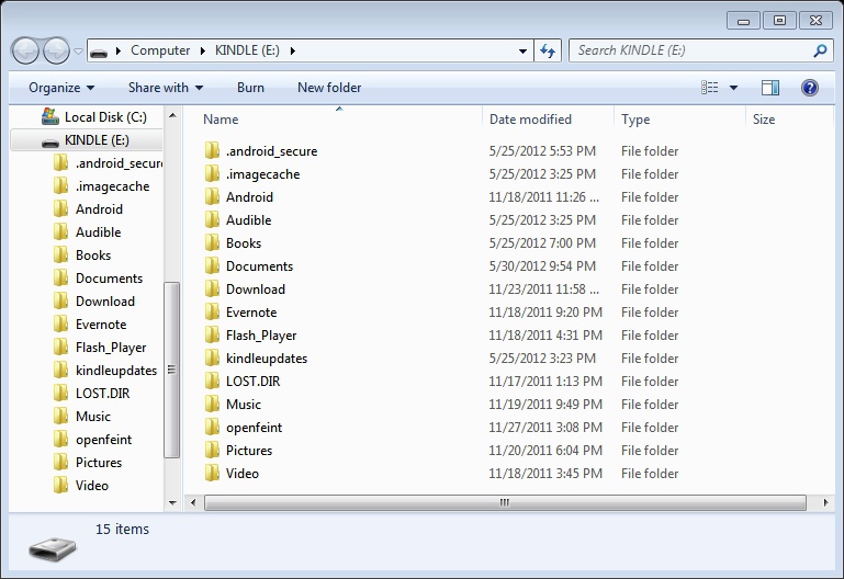 - Your Kindle enters into USB Drive mode. A drive labeled "KINDLE" will appear on your computer (On Windows it'll be in "My Computer," and on macOS it appears on the Desktop). Clicking on the KINDLE drive on Windows will reveal this: